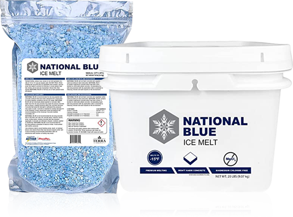 National Blue Ice Melt contains no added magnesium chloride whichhas been shown in studies to chemically attack concrete. Incorparating liquid anti-icing practices with dry application is essential to reducing chloride and salt impacts on the enviroment. Safe for pets and their paws.